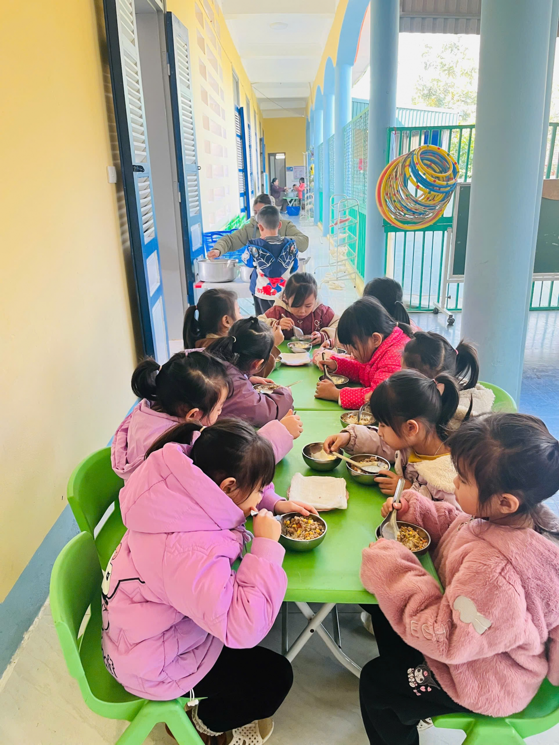 Đặc biệt với bữa ăn ở trường, trẻ được trải nghiệm một số kỹ năng thực hành đơn giản trong cuộc sống như: rửa tay, khi ăn, giúp cô chia bát, lau miệng,…Trẻ được ăn theo các nhóm nhỏ cùng nhau, giúp trẻ hào hứng thi đua ăn nhanh hết suất của mình, tạo tâm thế vui vẻ cho trẻ khi ăn. Những cảm giác đó giúp cho trẻ ăn ngon miệng và hấp thụ thức ăn tốt hơn