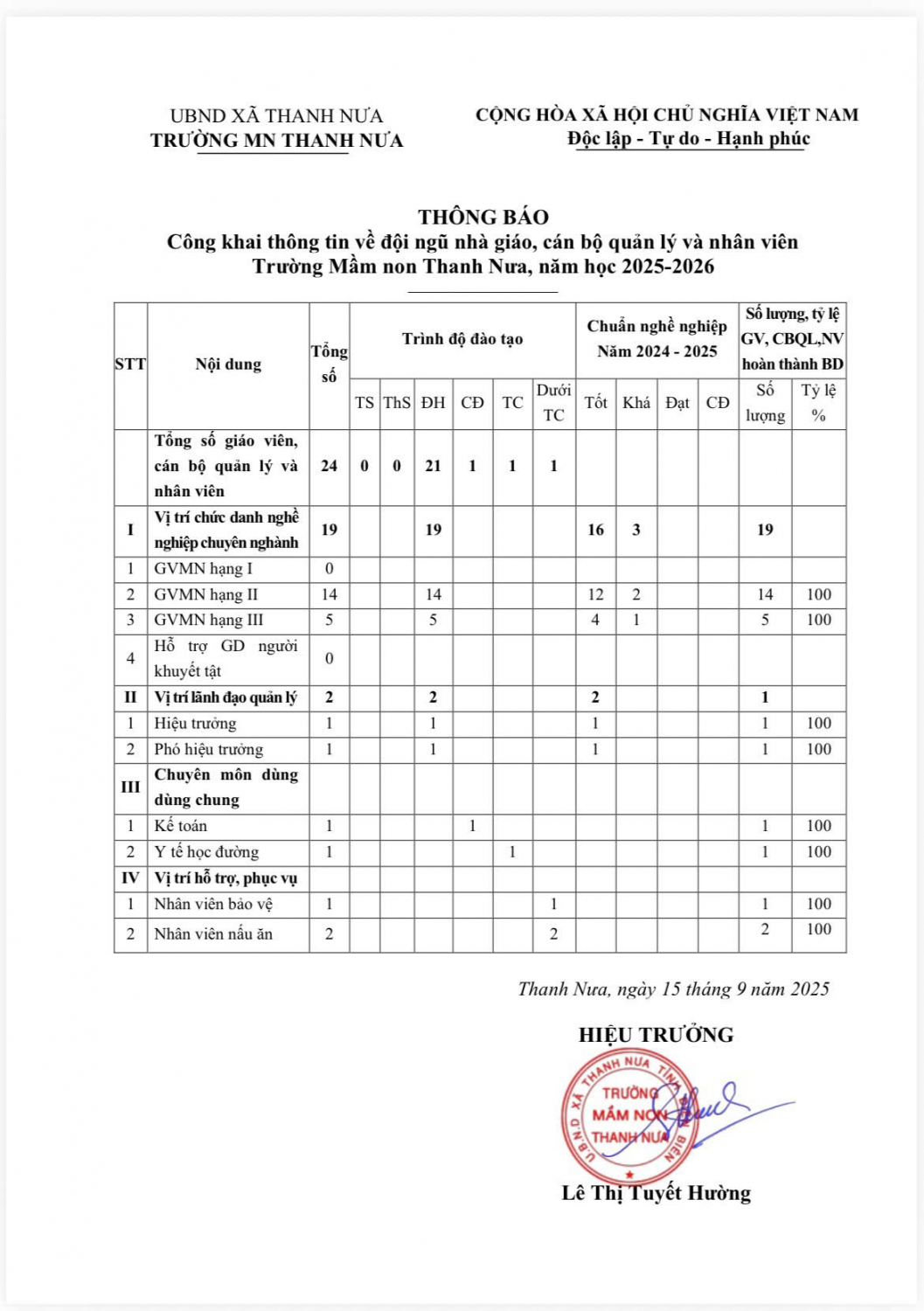 THÔNG BÁO Công khai thông tin về đội ngũ nhà giáo, cán bộ quản lý và nhân viên Trường Mầm non Thanh Nưa, năm học 2025-2026