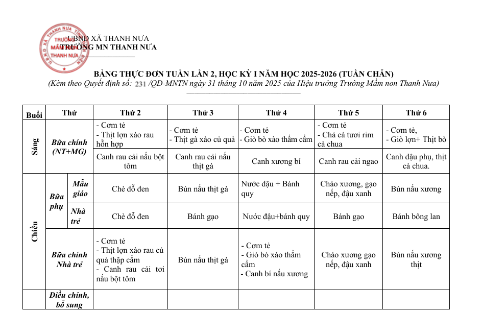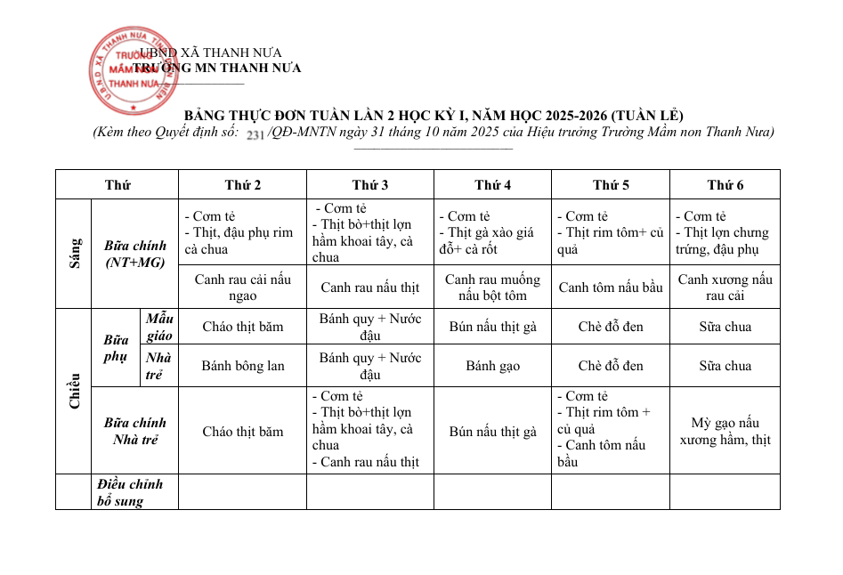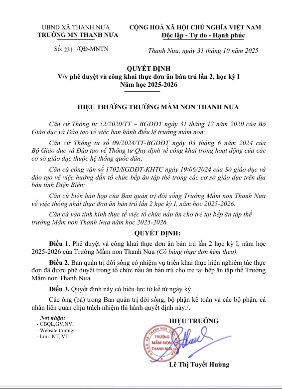 Quyết định về việc phê duyệt và công khai thực đơn ăn bán trú lần 2, học kỳ I Năm học 2025-2026