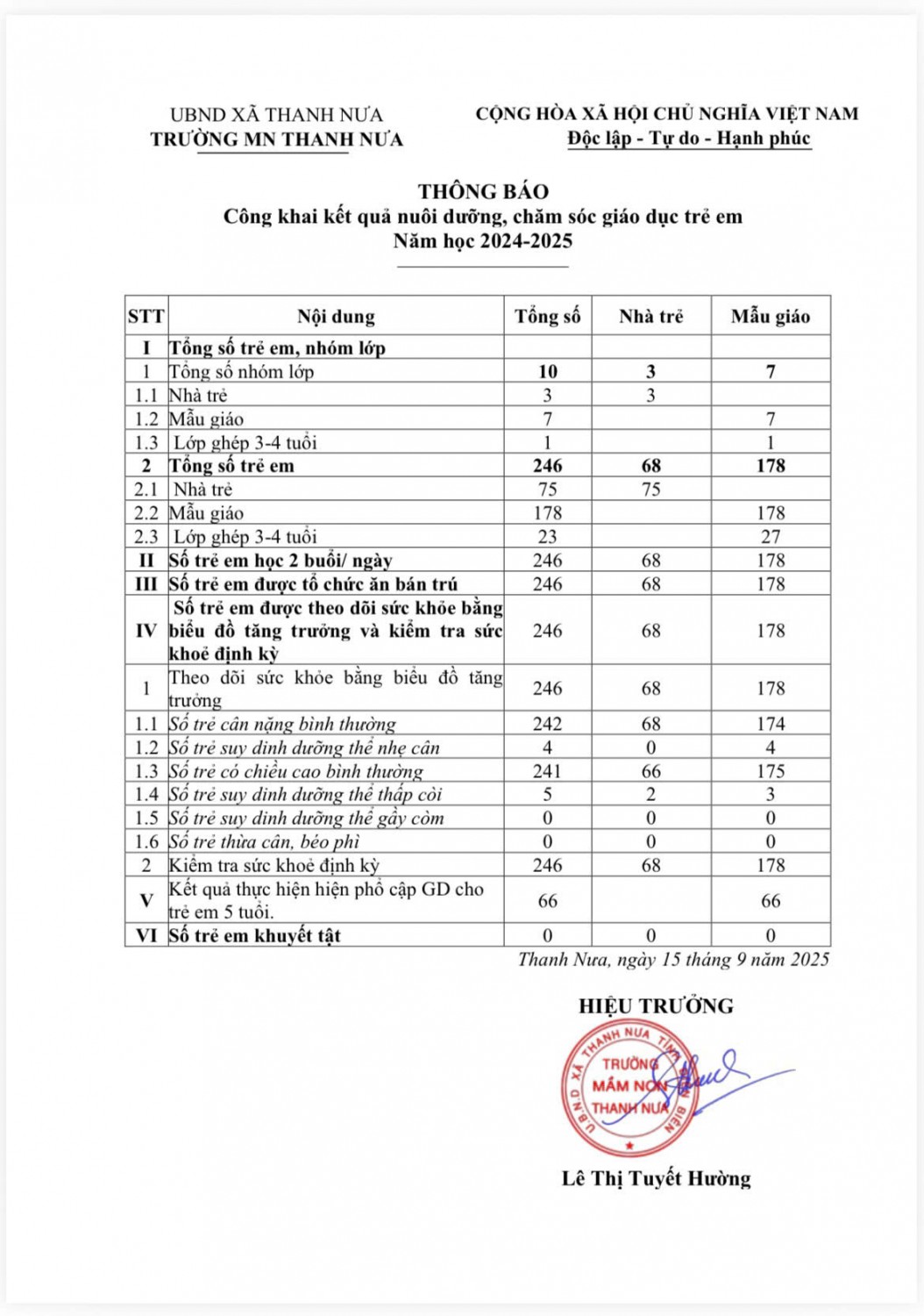 THÔNG BÁO Công khai kết quả nuôi dưỡng, chăm sóc giáo dục trẻ em Năm học 2024-2025
