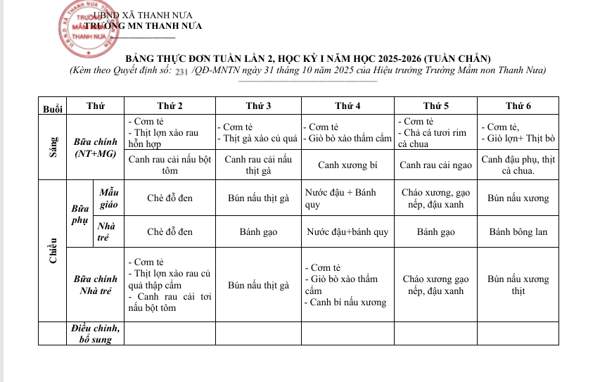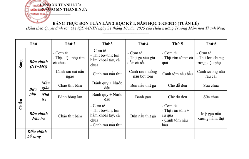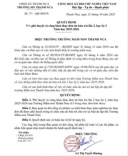 Quyết định về việc phê duyệt thực đơn ăn bán trú lần 2, học kỳ I Năm học 2025-2026